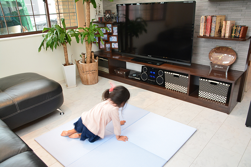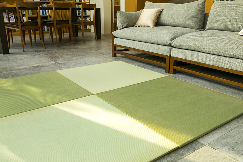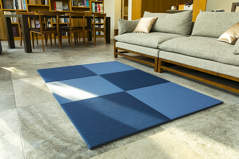 秋吉の人気置き畳シリーズを使ったお部屋のおすすめコーディネート例です。モダンな洋風フローリングリビングにもデザイン性の高いOITOKOが馴染んで癒しの空間を演出しています。お子様のいらっしゃるご家庭のリビングにはポップカラーの置き畳もおすすめ。