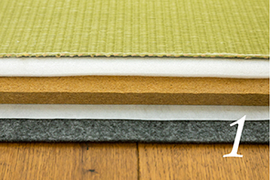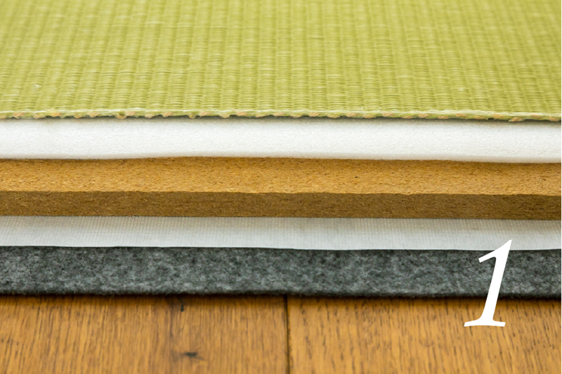 1. 断面図からはこだわりの素材をご覧いただけます。上から、「厳選された畳表」「居心地の良いクッション」「インシュレーションボード」「反りを防ぐ反り止めシート」「全面すべり止め」で構成されています。インシュレーションボードは茶殻に含まれている緑茶成分の消臭効果などが爽やかな空間創りをしてくれます。
